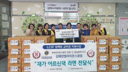 [제주교통복지신문 김강석 기자] 김해시자원봉사센터는 국제라이온스협회 355-C지구 김해한별라이온스클럽에서 라면 120박스를 기탁했다고 26일 밝혔다.