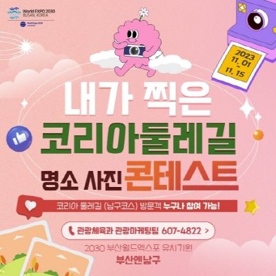 [제주교통복지신문 김강석 기자] 부산광역시 남구는 남구 코리아둘레길의 매력 발굴, 대외 홍보 및 마케팅에 적극 활용하고자 코리아 둘레길 (남구코스) 방문객을 대상으로 “내가 찍은 코리아 둘레길 관광명소”사진 콘테스트를 진행한다.