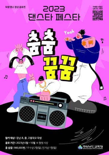 공모제에 관심 있는 청소년은 1분 미만의 춤 영상 작품을 누리집에 올리면 된다. 또 인스타그램과 유튜브에 해시태그(#경상남도교육청, #경남교육춤꿈, #춤춤꿈꿈, #2023댄스타페스타)를 달아 올려도 된다.