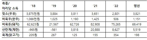 다만, 생산비 중 사료비가 차지하는 비중이 높은(57.9%) 젖소와 경기 위축 등에 따른 수요 감소, 사육마릿수 증가에 따른 도축 증가로 도매가격이 하락한 한우를 제외한 돼지, 계란 등 다른 축종의 경우 사료비 등이 급등하기 전인 2021년보다는 낮지만, 평년 이상의 소득 수준을 보이고 있다.