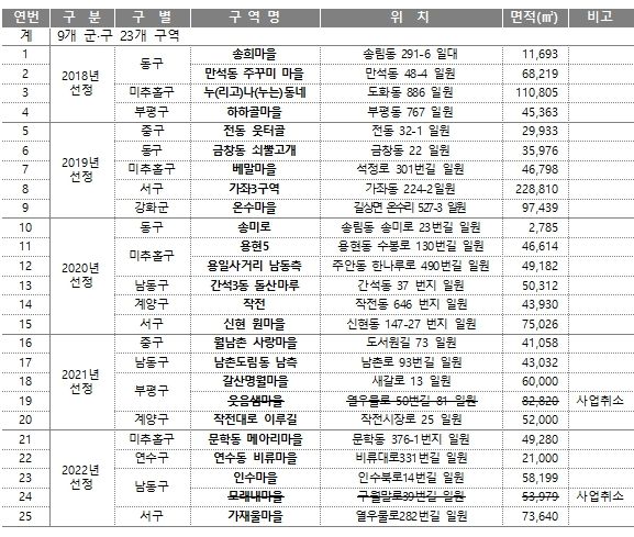 원도심 저층주거지 재생사업은 현지개량형 주거환경개선사업으로 현재 9개 군·구 23개 구역에서 추진중이다.(붙임파일 참조)