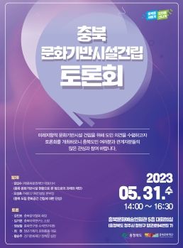 [제주교통복지신문 김강석 기자] 충북도는 오는 31일 오후 2시 충북문화예술인회관 5층 대회의실에서 충북 문화기반시설 건립 토론회를 개최한다고 밝혔다.