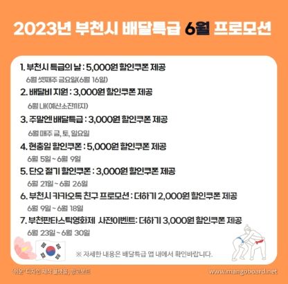 오는 6월에도 ▲ 5,000원 쿠폰을 제공하는‘부천시 특급의 날’▲ 3,000원 쿠폰을 제공하는‘배달비 지원’▲ 3,000원 쿠폰을 제공하는‘주말엔 배달특급’▲ 5,000원 쿠폰을 제공하는‘현충일 할인’ ▲ 2~3,000원 쿠폰을 제공하는‘단오 절기 할인’▲ 더하기 2,000원 쿠폰을 제공하는‘부천시 카카오 친구추가 할인’▲ 더하기 3,000원 쿠폰을 제공하는‘부천판타스틱영화제 사전이벤트’등의 풍족한 할인 혜택을 제공할 예정이다.