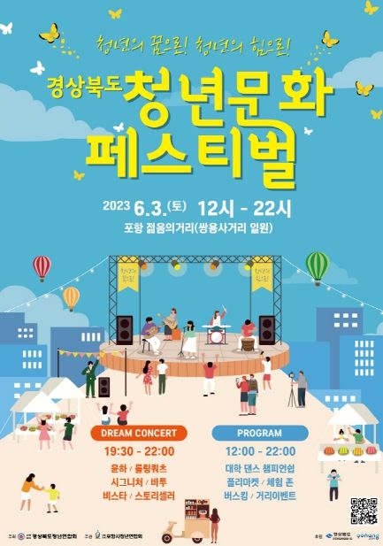 [제주교통복지신문 김강석 기자] 포항시는 3일 상대동 젊음의 거리 일원에서 ‘청년의 꿈으로! 청년의 힘으로!’라는 주제로 ‘경상북도 청년문화 페스티벌’을 개최한다.
