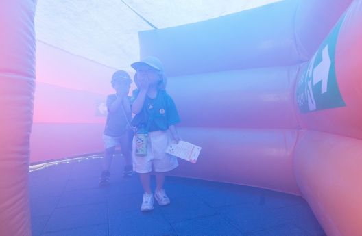[제주교통복지신문 김강석 기자] 26일 마곡나루역 인근 마곡광장에서 열린 ‘2023 강서 재난안전 체험박람회’에서 아이들이 화재 대피 체험 부스에 들어가 입과 코를 막고 길을 따라 이동하고 있다. 강서구는 아이들이 화재, 지진 등 재난상황에 대응할 수 있도록 직접 체험할 수 있는 놀이형 중심의 재난안전 체험박람회를 열었다.