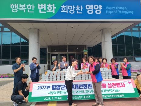 이번 행사는 우리지역 취약계층인 장애인들의 제일 큰 어려움인 식사 문제를 도와주고자 계획하여 추진을 했으며, 생활개선회원들이 4월부터 3회에 걸쳐 눈개승마, 어수리, 개두릅, 산마늘을 활용하여 맛있는 장아찌를 만들어 1kg씩 반찬통에 담아 영양군 장애인단체에 300개를 전달했다.