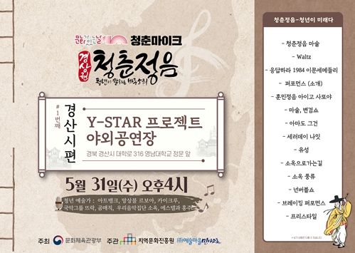 [제주교통복지신문 김강석 기자] 2023년 문화가 있는 날 ‘청춘마이크’ 경상권 공연이 5월 문화가 있는 날 주간에 경상지역 전역에서 열린다. 그 첫 번째 공연인 경산시 편이 오는 31일 오후 4시 경산 Y-STAR 야외공연장에서 화려한 문을 연다. 카이크루, 에스텔&홍주, 아트뱅크, 국악그룹 뜨락, 곰매직, 앙상블 르보아, 우리음악집단 소옥 팀이 공연을 준비해 스트릿댄스, 대중음악, 마술, 국악, 양악 등 다양한 장르를 선보일 예정이다.