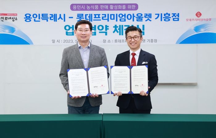 [제주교통복지신문 김강석 기자] 용인특례시가 지난 27일 롯데프리미엄아울렛 기흥점과 ‘용인시 농업인과 중소기업 판로지원 활성화를 위한 업무 협약’을 맺고 농산물과 가공제품의 판로를 확대하기 위해 공동으로 협력하기로 했다.