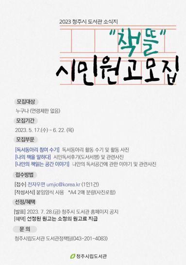 [제주교통복지신문 김강석 기자] 청주시립도서관은 독서와 관련된 시민들의 소중한 경험을 공유하기 위해 청주시 도서관 소식지 ‘책뜰’에 게재될 시민원고를 모집한다고 27일 밝혔다.