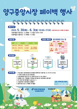 페이백 행사는 지역경제 활성화 및 전통시장 이용 분위기 확산을 위해 마련됐으며, 행사 기간 동안 양구중앙시장에서 3만 원 이상 상품 구매영수증을 시장 내 배부처(양산정육점 앞)에 제출하면 지급기준에 따라 시장이용권을 지급받을 수 있다.