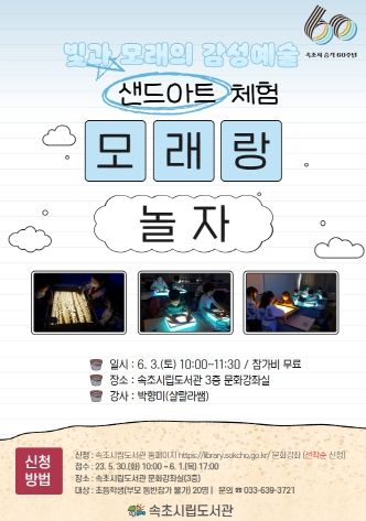 첫 번째 프로그램인 「모래랑 놀자」는 6월 3일 10시 시립도서관 문화강좌실에서 운영되며, 모집대상은 초등학생(부모동반 참가 불가) 20명으로 신청은 속초시립도서관 홈페이지를 통해 5월 30일 오전 10시부터 6월 1일 17시까지 온라인으로 선착순으로 받는다.