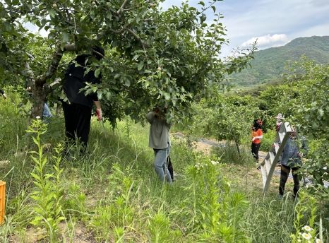 이날 농촌일손 지원은 부계면장을 비롯한 부계면 행정복지센터 직원들이 오전 9시부터 부계면 남산리 약 1,000평 규모의 사과농장을 방문해 사과 적과 작업을 도왔다.