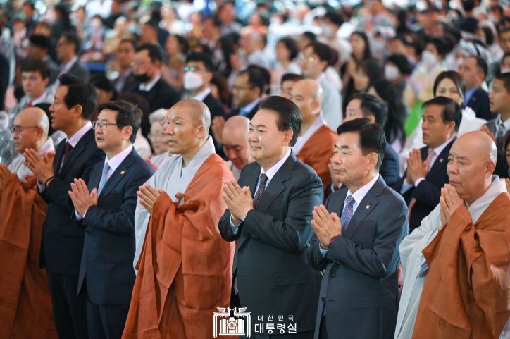 이어서 본 행사에 참석한 대통령은 축사를 통해 “어려운 이웃의 아픔을 보듬고 어루만지라는 부처님의 가르침은 우리 사회의 따스한 등불이 되고 있다”며, “한국불교는 우리 국민의 기쁨과 아픔을 함께 나누고 나라가 어려울 때는 이를 극복하기 위해 앞장섰다”고 말했다. 또 불교계의 튀르키예, 시리아 지진 피해 관련 이재민 구호활동 및 문화유산 보존, 전승 활동과 관련해 감사를 표하며 “우리 정부가 지향하는 인권 존중과 약자 보호, 세계 평화의 국정철학은 바로 부처님의 가르침에서 나오는 것”이라고 밝혔다. 대통령은 이어서 “정부는 어려운 이웃들을 더 따스하게 살피고 국민의 삶 구석구석 희망이 스며들 수 있도록, 그리고 세계시민 모두와 함께 서로 도와가며 평화를 찾을 수 있도록 최선을 다하겠다”고 강조하며 축사를 마쳤다.