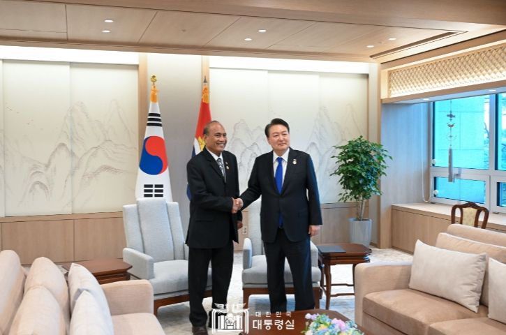 [제주교통복지신문 김강석 기자] 윤석열 대통령은 5. 28일 오후 ‘2023 한-태평양도서국 정상회의’ 참석차 방한한 타네시 마아마우(Taneti Maamau) 키리바시 대통령, 시아오시 소발레니(Siaosi Sovaleni) 통가 총리, 카우세아 나타노(Kausea Natano) 투발루 총리, 이스마엘 칼사카우(Ishmael Kalsakau) 바누아투 총리, 제임스 마라페(James Marape) 파푸아뉴기니 총리와 각각 정상회담을 가졌다.