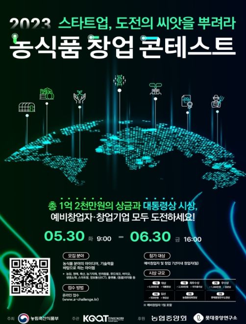 [제주교통복지신문 김강석 기자] 농림축산식품부는 농업의 미래를 이끌어 갈 유망 창업기업을 발굴하기 위하여 2023년 5월 30일부터 6월 30일까지 ‘2023년 농식품 창업콘테스트’ 참가자를 모집한다.
