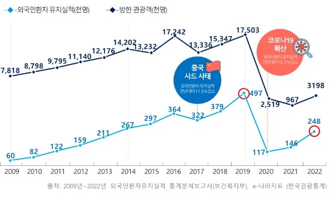 2022년 방한 외국인 환자는 24.8만 명으로 2021년 14.6만 명 대비 70.1% 증가했으며, 이는 코로나19 세계적 유행(팬데믹) 이전 2019년(49.7만 명) 대비 50% 수준까지 회복된 수치이다.