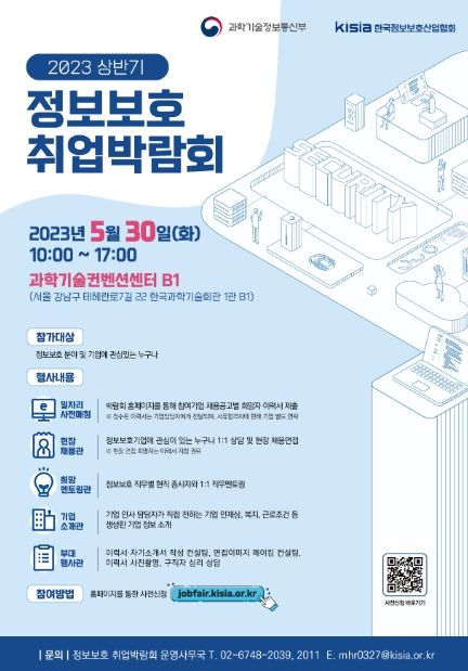 [제주교통복지신문 김강석 기자] 과학기술정보통신부는 한국정보보호산업협회와 함께 5월 30일에 과학기술컨벤션센터에서 ‘2023 상반기 정보보호 취업박람회’를 개최한다고 밝혔다.