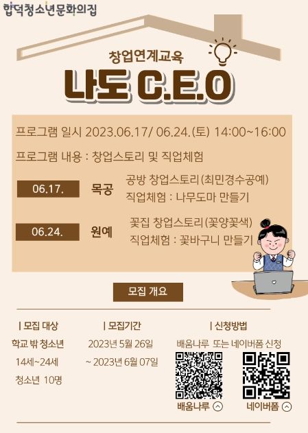 나도 C.E.O는 5월 26일부터 6월 7일까지 배움나루 또는 네이버 폼을 통해 신청 받을 예정이다. 정원 초과시 합덕 관내 청소년이 우선적으로 접수되며, 차순위로 당진시 관내 청소년을 대상으로 확대된다.
