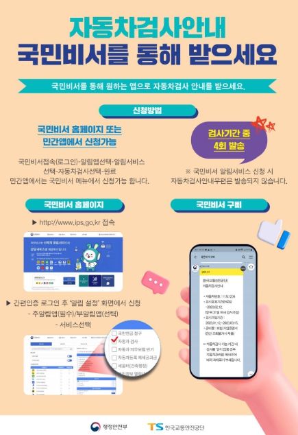 차량 소유자가 국민비서 구삐 누리집 또는 앱을 통해 간단하게 자동차 검사 안내 서비스를 신청할 수 있으며, 서비스를 신청하면 검사 기간에 4회에 걸쳐 검사 관련 안내를 받을 수 있다.
