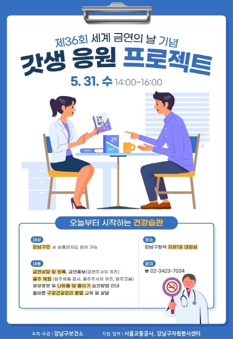 [제주교통복지신문 김강석 기자] 꿈이 모이는 도시, 미래를 그리는 강남구가 제36회 세계 금연의 날을 맞아 강남구청역 지하 1층에서 구민 200여명을 대상으로 31일 수요일 14시부터 16시까지 ‘갓생 응원 프로젝트’를 실시한다.