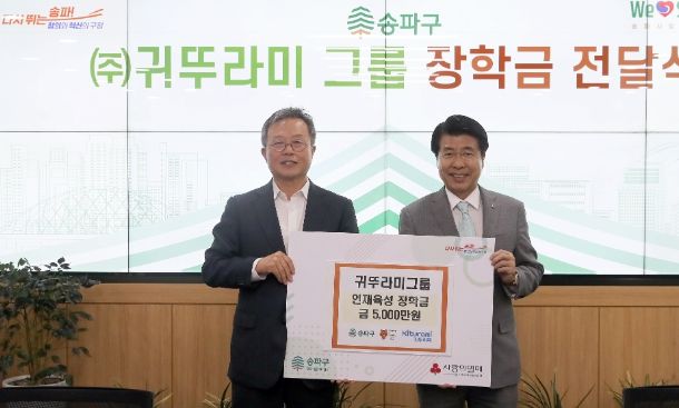 구는 지난 5월 23일 송파구청에서 서강석 구청장과 송경석 ㈜귀뚜라미 홀딩스 대표이사가 참석한 가운데 장학금 전달식을 가졌다. 후원받은 장학금은 관내 저소득층 등 어려운 환경 속에서도 학업을 이어가는 학생 38명에게 지원된다. 고등학생 26명에게는 각 100만 원씩, 대학생 12명에게는 각 200만 원씩 전달될 예정이다.