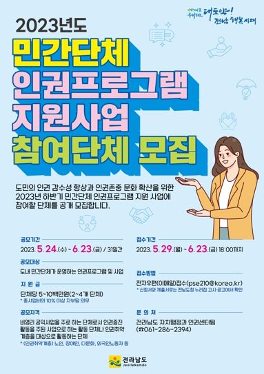[제주교통복지신문 김강석 기자] 전라남도는 도민의 인권 감수성 향상과 인권 존중 문화 확산을 위한 ‘2023년 하반기 민간단체 인권프로그램 지원 사업’에 참여할 단체를 공개 모집한다고 밝혔다.