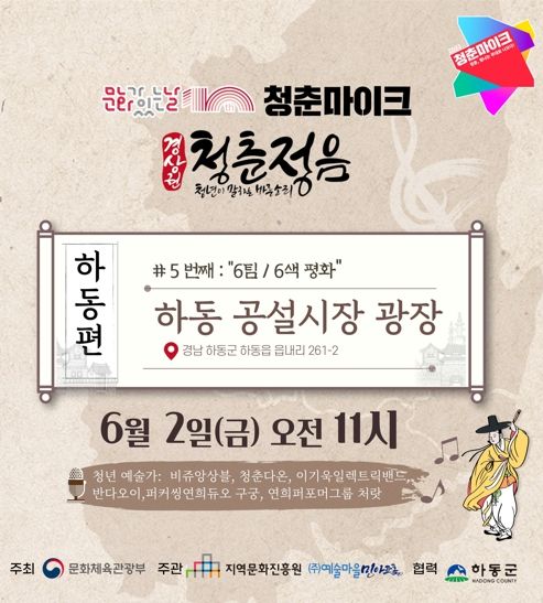 [제주교통복지신문 김강석 기자] 하동군은 6월 2일 오전 11시 하동공설시장 야외무대에서 문화가 있는 날 ‘청춘 마이크’ 경상권 공연을 연다고 30일 밝혔다.