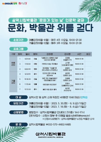 [제주교통복지신문 김강석 기자] 삼척시립박물관은 5월 30일(화)부터 6월 9일(금)까지 ‘문화, 박물관 위를 걷다’ 인문학 특강 수강생을 모집한다.