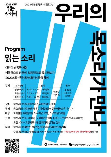 [제주교통복지신문 김강석 기자] 고양특례시는 2023 대한민국 독서대전을 유치해 시민들의 관심과 호응 속에 책의 도시 연중 프로그램을 진행하고 있다. 이번에는 어린이 낭독극 '우리의 목소리가 만나'를 오는 6월부터 9월까지 3개 어린이도서관(주엽·화정·행신어린이)에서 진행한다.