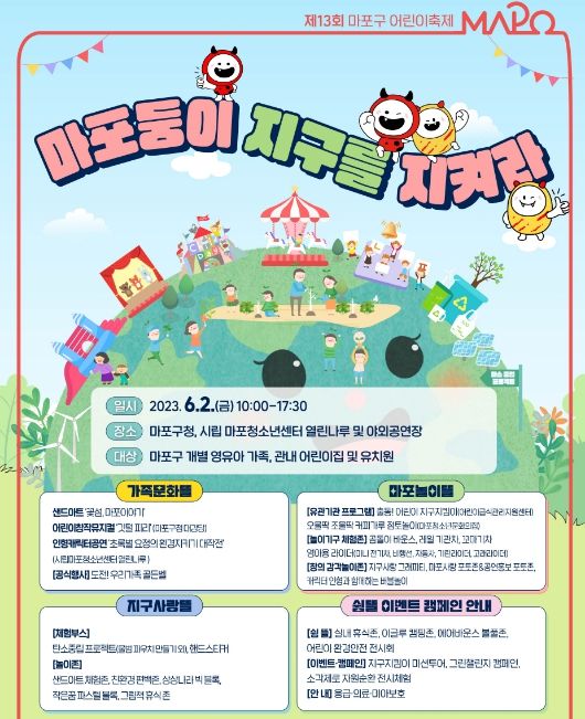 [제주교통복지신문 김강석 기자] 마포구가 오는 6월 2일 마포구청과 시립마포청소년센터에서 ‘제13회 마포구 어린이축제’를 개최한다.