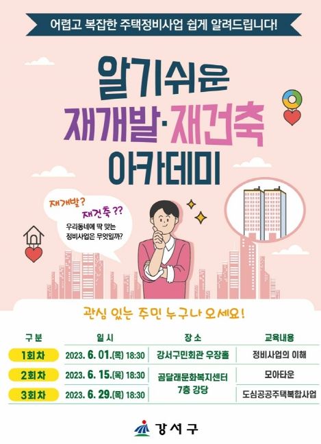 서울 강서구가 주민들의 가장 큰 관심사 중 하나인 재개발, 재건축에 대한 궁금증을 해결해 주기 위해 ‘알기 쉬운 재개발·재건축 아카데미’를 개최한다.