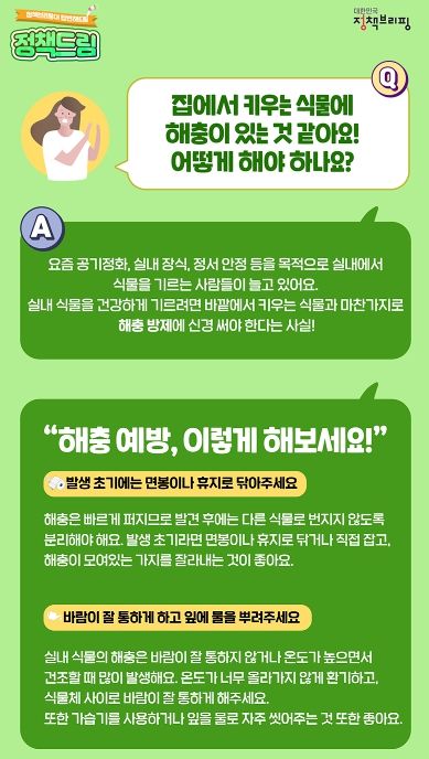 A. 요즘 공기정화, 실내 장식, 정서 안정 등을 목적으로 실내에서 식물을 기르는 사람들이 늘고 있어요. 실내 식물을 건강하게 기르려면 바깥에서 키우는 식물과 마찬가지로 해충방제를 신경 써야 한다는 사실!
