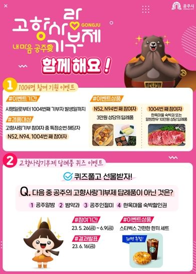 이에 따라 시는 고향사랑기부금 1억원 달성을 기념하고 고향사랑기부제에 대한 관심도를 높이기 위해 ‘내마음 공주애(愛), 고향사랑기부제 함께해요!’ 이벤트를 진행한다.