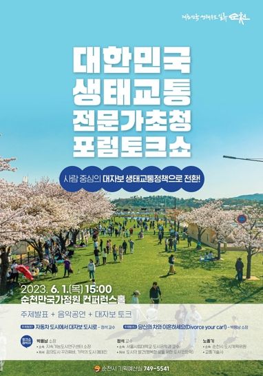 이번 행사는 대한민국 생태교통 전문가를 초청해, ‘사람 중심의 대자보 생태교통정책으로 전환!’을 주제로 한 포럼과 시민 공감대 형성을 위한 토크쇼로 구성된다. 진행 순서 사이에는 순천 청년들로 구성된 퓨전 국악․성악 그룹의 공연도 예정되어 있다.