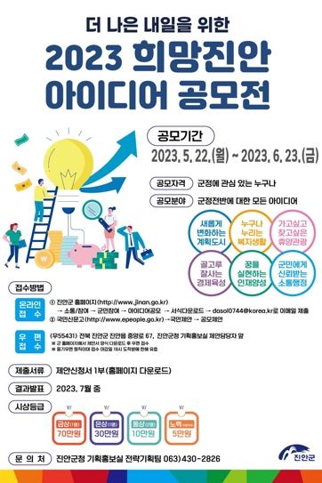 공모분야는 군정 전반에 대한 모든 아이디어로 국민 누구나 참여가 가능하며, 공모 접수는 오는 6월 23일까지 진안군청 홈페이지와 국민신문고, 우편 등을 통해 가능하다.