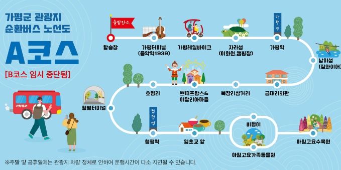 가평 시티투어는 주요 관광지를 거점별로 연계한 테마형 순환버스로 365일 연중무휴로 매일 1시간 간격으로 운행하고 있다. 탑승 요금은 성인 8,000원, 경로․청소년․군인․장애인 6,000원이다.