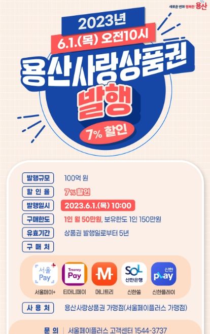[제주교통복지신문 김강석 기자] 서울 용산구가 내달 1일 오전 10시부터 구비 7억원을 투입해 용산사랑상품권 특별발행에 나선다. 발행규모는 100억원, 할인율은 7%다.
