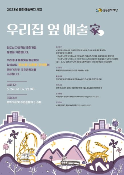 [제주교통복지신문 김강석 기자] 인천 남동문화재단은 문화예술복지 사업의 일환으로 ‘우리집 옆 예술家 프로젝트’에 참여할 문화거점 및 주민공동체를 모집한다고 30일 밝혔다.