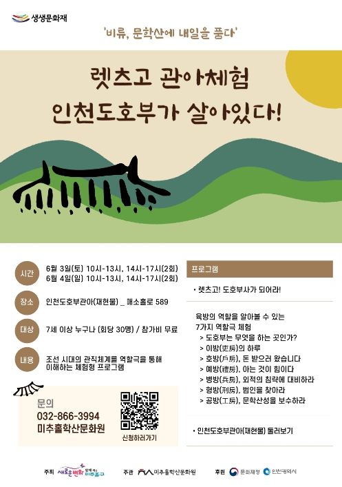 [제주교통복지신문 김강석 기자] 인천시 미추홀학산문화원은 6월 3일과 4일 인천도호부 관아를 생생하게 만나보는 체험 프로그램 렛츠古 관아체험 ‘인천도호부가 살아있다!’를 오전 10시~13시, 오후 14시~17시 총 4회차에 걸쳐 인천도호부관아 재현물 일대에서 진행한다.