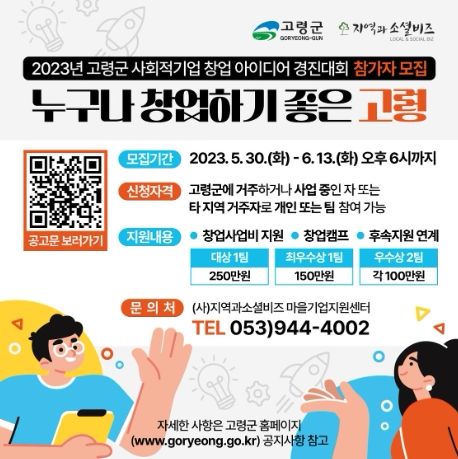신청은 고령군청 홈페이지 공지사항 공고문을 참조하여 신청서 등을 작성 후 이메일로 제출하면 되고 문의사항은 (사)지역과소셜비즈 마을기업지원센터로 하면 된다.