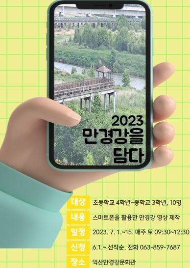 ‘만경강을 담다’는 스마트폰을 활용해 영상 콘텐츠를 제작하는 프로그램으로 스마트폰 영상 촬영과 편집에 필요한 다양한 교육을 배울 수 있다. 지역 초등학교 고학년이나 중학생이면 참가 가능하다. 해당 프로그램은 7월 1일부터 15일까지 매주 토요일, 총 3회 진행되며 만경강의 모습을 아이들의 시선으로 담아낼 예정이다.