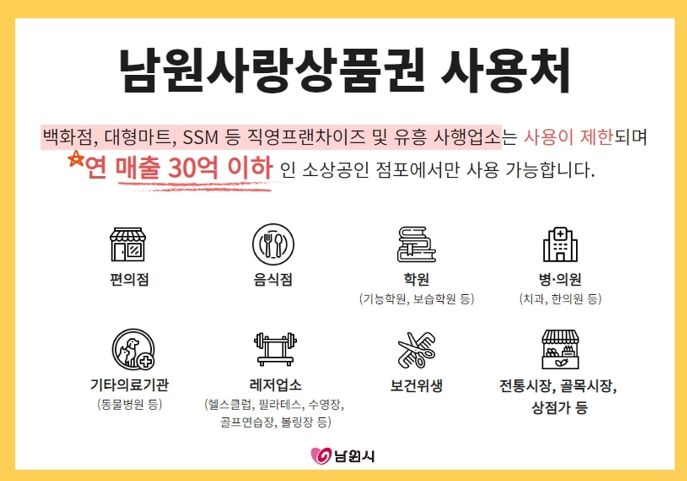 한편 최대 10%의 할인율로 68개의 금융기관에서 구매가능한 남원사랑상품품권 사용 가맹점은 2023년 5월 기준 4,000여 개에 달한다.