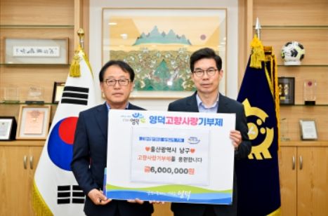 영덕군-울산 남구 고향사랑기부금 상생교차 기부는 영덕군과 울산 남구가 각 60명이 10만원씩 상대방 지자체에 기부해 목표금액 600만원 달성을 위하여 현재 활발히 진행 중이다.
