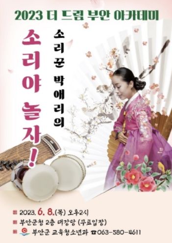 [제주교통복지신문 김강석 기자] 부안군은 오는 6월 8일 오후2시 부안군청 2층 대강당에서 2023 더 드림 부안아카데미 '소리야 놀자!'가 열릴 예정이다.
