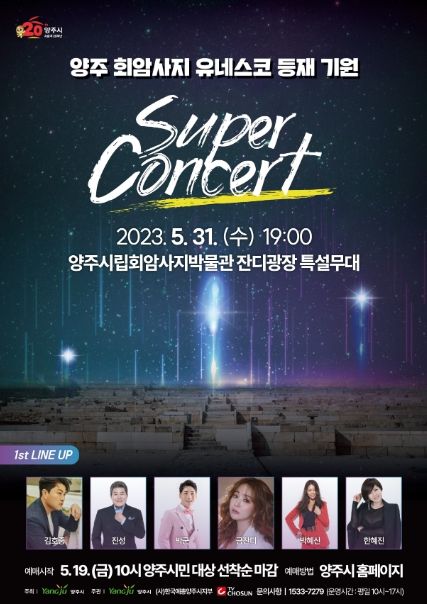 [제주교통복지신문 김강석 기자] 양주시는 오늘 31일 저녁 7시 양주시립 회암사지박물관 잔디광장 특설무대에서‘양주 회암사지 유네스코 등재 기원 콘서트(SUPER CONCERT)’를 개최한다.
