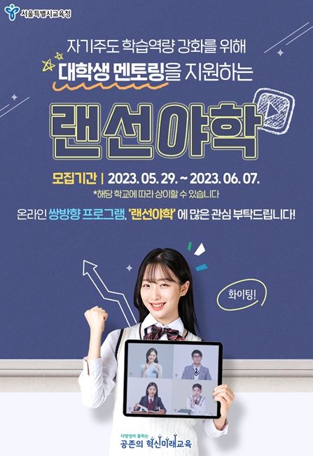 [제주교통복지신문 김강석 기자] 서울특별시교육청은 교육격차 해소를 위한 대학생 멘토링'랜선야학'6기를 6월 26일부터 11월 19일까지 총 20주 동안 진행한다.