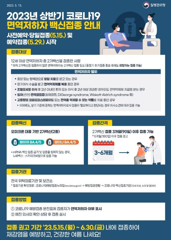 이에 더해, 질병관리청은 면역저하자 등 고위험군에 대한 상반기 코로나19 추가접종의 사전예약에 따른 예약접종이 5월 29일 시작됐다고 안내했다.