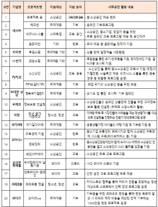 [제주교통복지신문 김강석 기자] 중소벤처기업부는 ‘함께 성장하는 프로젝트’의 시작으로 플랫폼 기업이 자발적으로 추진 중인 사회공헌 활동을 한자리에서 볼 수 있는 ‘함성! 희망(HOPE) 플랫폼’ 누리집을 5월 30일에 열었다.