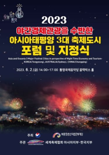 [제주교통복지신문 김강석 기자] 통영시에서는 오는 6월 2일 오후 2시부터 ‘2023 야간경제관광을 수반한 아시아, 태평양 3대 축제도시 포럼 및 지정식’을 3개국 200여명의 축제 전문가 등이 참여한 가운데 통영국제음악당 블랙박스에서 개최될 예정이다.
