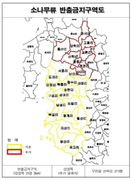 군은 소나무재선충병 확산 예방을 위해 감염나무 반경 2㎞ 이내(무안읍 신학리, 평용리, 매곡리, 고절리, 교촌리, 성남리, 현경면 양학리, 동산리, 청계면 사마리, 청천리)를 소나무류 반출금지 구역으로 추가 지정하고 소나무류 이동을 전면 제한하기로 하는 한편, 14일 이내 발생지 주변 산림에 대하여 무인기(드론) 등을 활용한 정밀 조사로 감염 의심 나무에 대한 예찰을 강화하기로 했다.